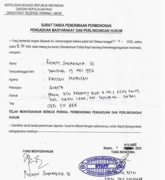 Bukti laporan dugaan pemalsuan perpajangan SK Kadin Provinsi Kepri ke SPKT Polda Kepri. Foto ist : doc/red.