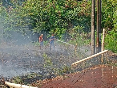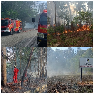 Api terlihat membakar vegetasi dan lahan kosong di lokasi tersebut. Kepulan asap sempat membumbung tinggi dan menarik perhatian warga serta pengendara yang melintas di sekitar tempat kejadian.