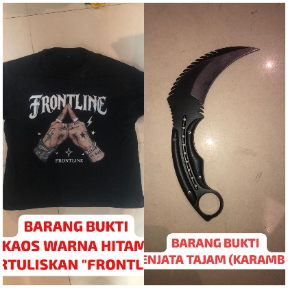 Polisi juga mengamankan sejumlah barang bukti, di antaranya satu bilah senjata tajam jenis karambit serta satu helai kaos berwarna hitam bertuliskan “FRONTLINE”.